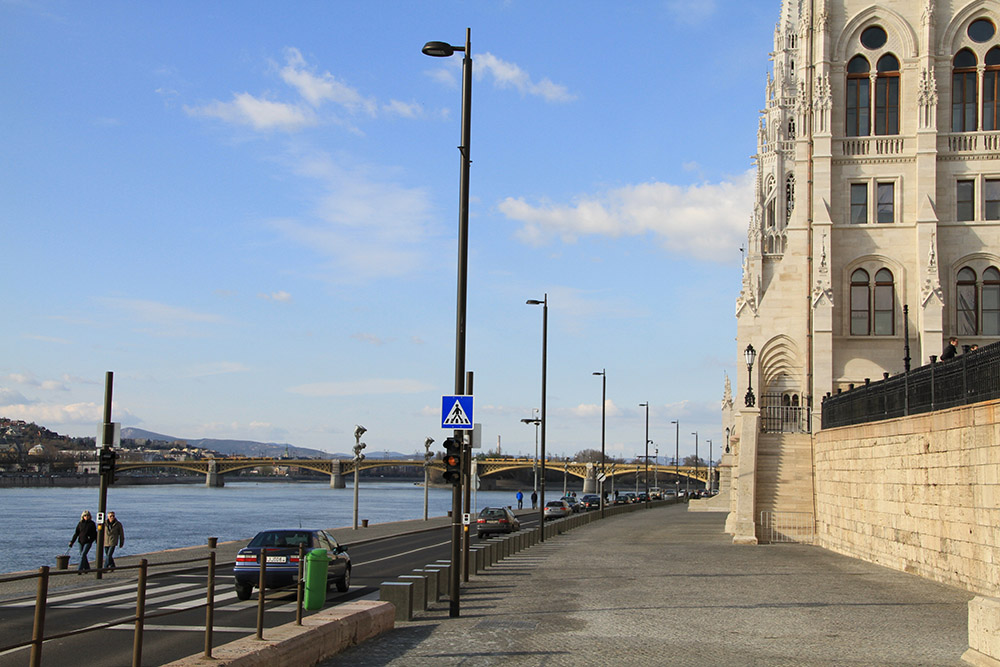 Látványra ugyanilyen egységek állnak a rakparton is, a különbség csak a fényforrásban van. Itt ugyanis kicsit disszonánsnak tetszett volna a Parlament sárga homlokzata előtti hidegfehér színű lámpasor, ezért az itteni közvilágítást melegfehér színű, 140 W Cosmopolis lámpákkal építették meg. A kétsávos úton 15 lux átlagos megvilágítás mérhető 0,43 középegyenletességgel.