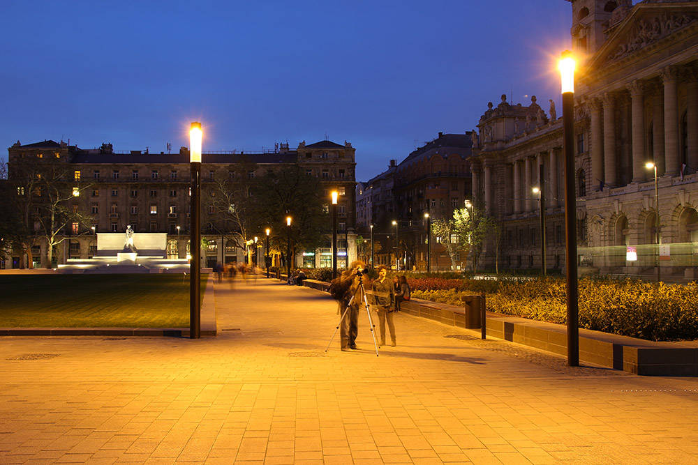 A tér közepének kifogásolható sötétsége mögött ugyanakkor nem látszik semmilyen igazolhatóan tudatos szándék. Ha megpróbálunk hasonlóságokat keresni, talán a Hősök tere alkalmas az összevetésre, ott azonban a középső, hasonló méretű megvilágítatlan területet 13 m magas kandeláberekre szerelt 150 W-os fémhalogénlámpás egységek szegélyezik, melyek fénye alkalmas a biztonságos gyalogosközlekedésre. Itt a magasabb oszlopellenes hangulat megakadályozta, hogy hasonló hatású közvilágítás épüljön az említett térrész körül.