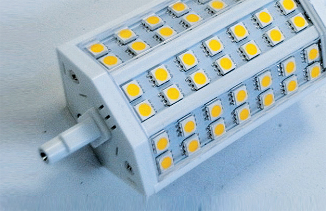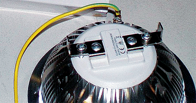 A laborunkban megfordult, kifogásolható konstrukciók közül említésre méltó a két végén fejelt halogénizzót (MSZ EN 60432-3) kiváltó (3. kép), vagy a 111 mm átmérőjű fémtükrös G53 fejelésű halogénlámpa (MSZ EN 60432-3) kiváltására szánt LED fényforrás (4. kép). Előbbi méretbeli és termális jellemzői miatt elgondolkodtató, utóbbi pedig súlyos kérdéseket vet fel az alkalmazott feszültségszintet és érintésvédelmi kérdéseket illetően. A két végén fejelt LED lámpát behelyezve a ceruza halogénlámpához készült hagyományos fényvető lámpatestbe, a jelentősen eltérő alakú fényforrás sarkai, kiálló élei miatt az alumíniumtükör megsérült. Az R111 lámpa ennél sokkal komolyabb problémát vet fel, amelyet az elődjének tekinthető halogénlámpa törpefeszültségű megtáplálásától eltérően a gyártó hálózati megtáplálásra szánt. Ez a megoldás szükségessé teszi a befogadó lámpatest átalakítását, ezáltal komoly érintésvédelmi kérdéseket vet fel. Az új LED-es konstrukcióra vonatkozó szabvány adatlapot nem adtak ki, ezért a fejelés és a tápfeszültségszint tekintetében az eredeti R111 halogénlámpára vonatkozó adatlap névleges értékei érvényesek, az abban foglalt követelményeket kell szem előtt tartani. Szerzői jogvédelmi okból képkivonatot nem idézhetek a szabványból, de megjegyzem, hogy 6 V tápfeszültségen 35 W, míg 12 V-on 35, 50, 75 és 100 W teljesítményt határoz meg a G53 fejű és 111 mm átmérővel rendelkező fémreflektoros fényforrásra vonatkozó (60357-IEC-6450-1) szabvány adatlap. Felhívnám a figyelmet a képen látható zöld-sárga védőföldvezetékre, mely felveti az érintésvédelem kérdését is. A Class I (egyes érintésvédelmi) osztályba sorolt lámpatesteknél szokásos megoldást jelen esetben fényforrásoknál alkalmazva további konstrukciós kérdésekbe ütközünk.