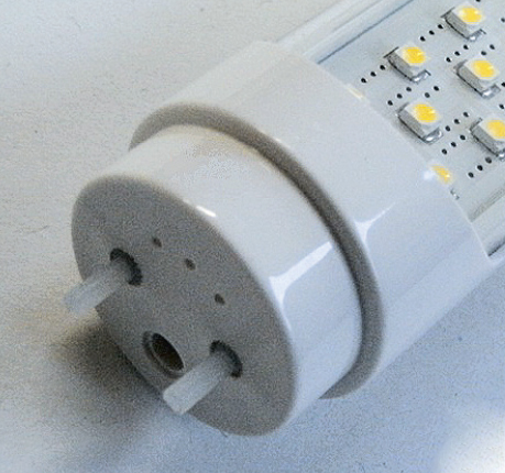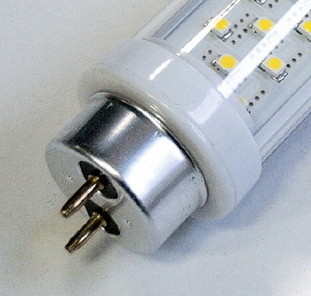 Ha ipari világításkorszerűsítésről beszélünk, mindenképpen meg kell említenünk a fénycsövek kiváltására szánt különböző LED csöveket (5. kép). A fénycső eredendően két végén fejelt kisnyomású kisülő fényforrás – az üzemeltetés jellegét tekintve magnetikus előtéttel és a körbe iktatott gyújtóval vagy elektronikus előtéttel szerelve. A piacon elérhető LED cső konstrukcióknak sajnos csak egy része elégíti ki a csereszabatosság feltételét, vagyis azt, hogy a retrofit fényforrást a lámpatest átalakítása nélkül üzemeltessük (megengedett a gyújtó kicserélése rövidzárra). E tekintetben mindenképpen problémás az egy végén megtáplált konstrukció, mely a cső villamos kontaktust nem tartalmazó végén csak műanyag csapokkal rendelkezik (6-7. kép). Villamos biztonságtechnikai szempontból aggályokat vet fel az ún. állítható fejű LED cső, mely rendelkezhet akár mindkét végén a fénycsöveken megszokott G13 fejjel, de konstrukciójából adódóan nem teljesíti a fejkötésre vonatkozó követelményeket (8-9. kép). A szokásos chip-on-board kivitelű LED csövek fényeloszlása eltér a fénycsőétől, ebből adódóan, akár alutükrös, akár szabadon sugárzó lámpatestbe kerül, a fényeloszlás jellegét elsődlegesen a LED optikai jellemzői fogják meghatározni.