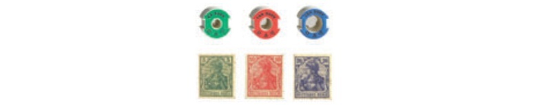 Ráadásul a jelzőszem és a közbetét gyűrű a névleges áramra utaló színjelölést is kapott a könnyebb azonosítás végett. Ennek nyilvánvaló hasznát nem kell nagyon bizonygatni (például mennyivel érthetőbb, és könnyebben megjegyezhető Mari néni számára az, hogy mindig zöld pöttyös betétet kell betennie, mint az, hogy 6 amperest). Ugyanakkor az nem nagyon köztudott, hogy a színjelzések mögött milyen logika áll. Nem véletlenszerűen rendelték azokat az egyes áramértékekhez, hanem ‑a könnyebb megjegyezhetőség érdekében ‑ az akkoriban használatos bélyegsorozat színeihez igazították. A növekvő névértékű bélyegeken azonos mintázat volt, csak más-más színnel nyomtatva –ezzel egyezően kapták a növekvő áramértékek a színjelüket (3. ábra).
