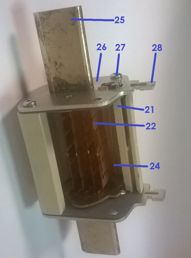 Az olvadóelem (itt már valóban nem beszélhetünk egyszerűen olvadószálról!) áramerősségtől függően egy vagy több vékony lemez, kicsípésekkel, helyenként rátét fémmel vagy egyéb kiegészítőkkel, ami gondos mérnöki tervezés valamit sok-sok kísérlet nyomán fölhalmozott tapasztalat eredménye. Adott esetben 100 kA zárlati áram nyomán kialakuló több ezer fokos villamos ívvel elbánni ilyen kis térfogatban nem tréfadolog! A kvarchomok töltetnek ebben kulcsszerepe van: megolvadása során rengeteg hőt von el az ívből, ami segíti annak kioltását, ráadásul jó hővezető képességével gyorsan ki is viszi a termelődő hőt a kerámia test falára, a környezet felé. Legalább ilyen fontos azonban az olvadóelemek anyaga és geometriája. A kicsípések pozíciója és száma határozza meg hol, hány helyen alakul ki majd ív. Több kis ív kioltására nagyobb az esély, mint egyetlen összefüggőére. A kicsípések mérete és alakja, egymáshoz viszonyított helyzete, az olvadóelem anyaga alapvetően befolyásolja a betét karakterisztikáját, ami az adott szabvány által rögzített, és a katalógusban megadott jelleggörbének megfelelő kell, hogy legyen.