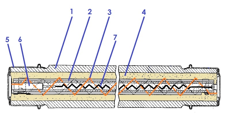 Olvadóbiztosítókról lévén szó ez nem túl pajzán kérdés. Arról az olvadóbetét típusról beszélünk, amit francia vagy hengeres típusnak ‑ a latinból származó szóval cilinder alakúnak, ezért röviden C-rendszerűnek hívunk. A lehető legegyszerűbb alakú eszköz ez: szabályos henger kerámiacső két végén teljesen szimmetrikusan lezárva fémsapkákkal (5. ábra). Hasonlatosak az elektronikai eszközökben használatos csöves betétekhez, ‑ez utóbbiak gyakran üvegből készülnek, így a bennük levő olvadószál épsége szemmel látható.