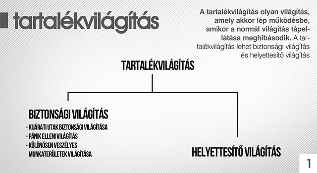 A tartalékvilágítás olyan világítás, amely akkor lép működésbe, amikor a normál világítás tápellátása meghibásodik. A tartalékvilágítás lehet biztonsági világítás és helyettesítő világítás (1. ábra).