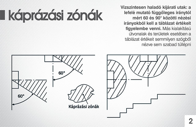 Vízszintesen haladó kijárati utak: a lefelé mutató függőleges iránytól mért 60 és 90° közötti nézési irányokból kell a táblázat értékeit figyelembe venni. Más kialakítású útvonalak és területek esetében a táblázat értékeit semmilyen szögből nézve sem szabad túllépni (2. ábra).