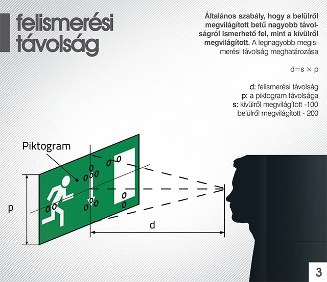 A biztonsági jelzések megvilágítása olyan legyen, hogy a fénysűrűség 5 másodpercen belül az előírt érték 50%-át, egy percen belül pedig a teljes értéket érje el. A színek feleljenek meg az ISO 3864 követelményeinek. A biztonsági jelzés minden pontja, minden lényeges irányból nézve legalább 2 cd/m2 fénysűrűségű legyen. Ezt méréssel igazolni kell. A legnagyobb és legkisebb fénysűrűség aránya maximum 10:1 lehet. Ennek a követelménynek fehér falfelületen és bármely biztonsági szín felületén teljesülnie kell. A fehér felület Lfehér és színes felület Lszínes fénysűrűségének aránya 5:1 és 15:1 között legyen. Ezt szintén méréssel kell igazolni. Általános szabály, hogy a belülről megvilágított betű nagyobb távolságról ismerhető fel, mint a kívülről megvilágított. A legnagyobb megismerési távolság meghatározása (3. ábra):