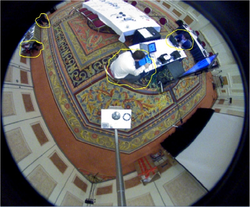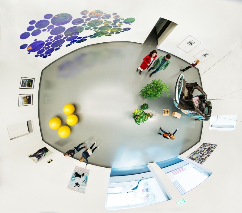 Mennyezeti 360°-os panorámakamera teljes képe – torzításmentesítés nélkül, aktív képtartalomelemzéssel. A nagy felbontású képanyag a megfelelő hatékonyságú tartalomelemzés alapja.
