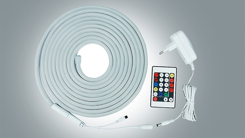 A Daniella Kft. új, 12 V-os Delux neon flex LED-szalagjai már elérhetők többféle kiszerelésben és színben. A DEL 1638 RGB-szett egy csomagban tartalmazza a felszereléshez szükséges összes tartozékot: 5 méter RGB neon flex szalagot, a hozzá tartozó RGB-távirányítót, 5 db rögzítőelemet, és a betápláláshoz szükséges hálózati adaptert. Az infrás távirányító segítségével 1, 3, 7, 16 színű fénykavalkád állítható be és 13 féle dinamikus színváltómód választható.